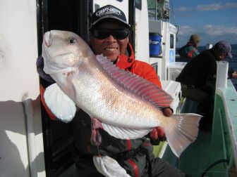 魚種 白アマダイ 26~50㎝ 1~8尾 赤アマダイ 37~42㎝ 2尾 他・レンコ鯛、カサゴ、カイワリ アオハタ、アジ 白アマダイ狙い 終日ポツポツでした 写真は松浦さん 1.53㎏ |