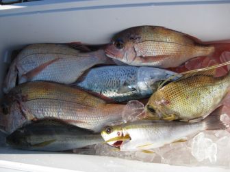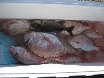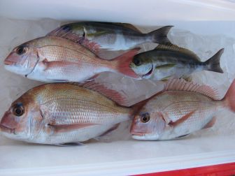 魚種 真鯛 0.5~1.2㎏ 0~3枚 イサキ 30~35㎝ 1~4尾 塩焼き真鯛サイズ 他・カサゴ、メイチダイ、ブダイ サバ、ワカナゴ 久々の真鯛狙い 写真の通り㎏未満が多かったです 前田さん 海野さん 杉山さん の釣り魚です |