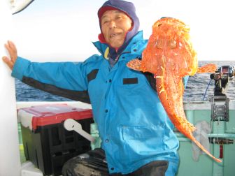 魚種 鬼カサゴ 26~45㎝ 1~6尾 他・レンコ鯛、アヤメカサゴ、メバル ハチカサゴ、フサカサゴ、ユメカサゴ 鬼退治へ・・・。 1尾は1名、他は3尾から上でした お昼前からは潮動きなくなり当たり遠く なりました 写真は榛地さん 1.21㎏ |